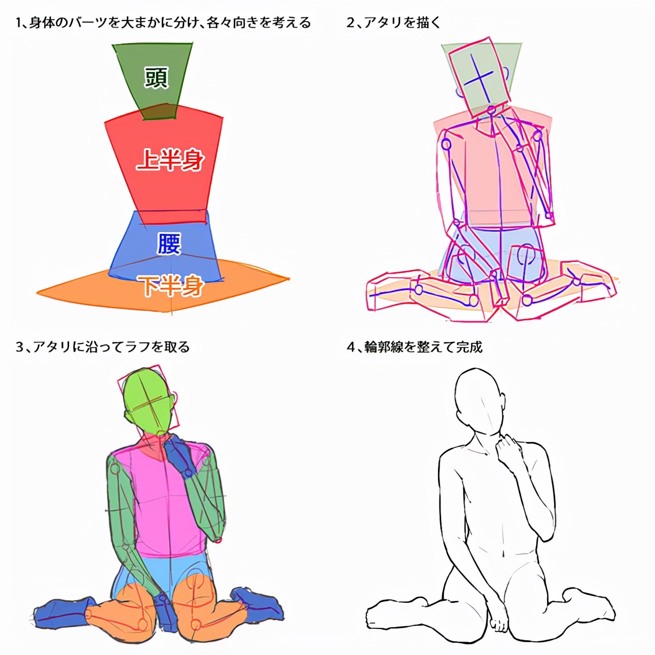 (2)坐在地板上的姿势(鸭子坐)的画法鸭子坐时,考虑从膝盖到底部的方向:从胫骨到脚趾。