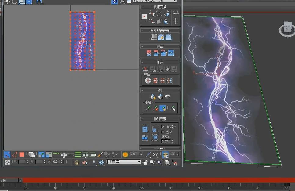 6)UV动画中设置扭动效果,可使闪电的流动更丰富,更自然。在UVW编辑器里选择部分点,打开软选择工具,给一个合适的数值(使用软选择可以将选择的对象在一定范围内以衰减的方式降低选择强度,使选择的范围由强到弱,使选择和没有选择的交接处过渡比较自然)。最后,通过移动点的位置来实现扭曲效果