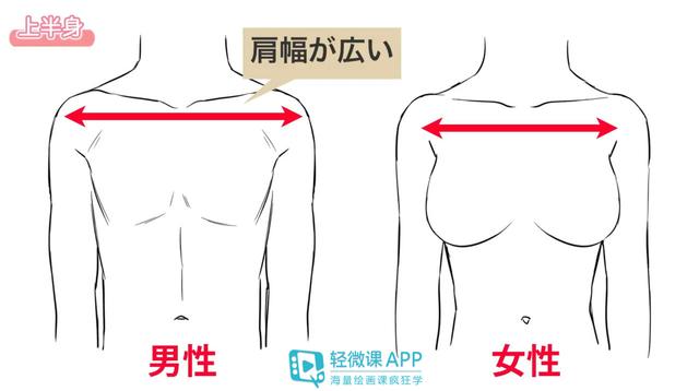 1.男性的肩膀比女性宽,男生的肩宽约为两个头宽度,而女性的肩宽的则比男生的肩宽更加的偏窄一些,约为一点五个头宽比例。