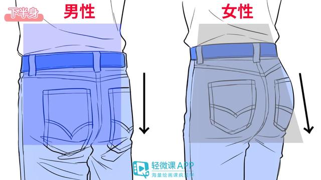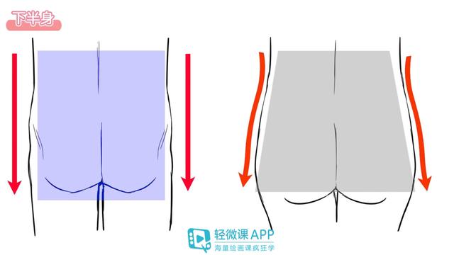 从背后观察,女性的腰部轮廓是曲线,就像梯形变宽延伸的形状,而男性的腰部轮廓则是笔直延伸的直线,像长方形一样的形状。在穿上长裤后,男性的腰部也没有呈现出曲线,把男性的上半身和腰部当做长方形来画的话,更能体现男性的帅气。