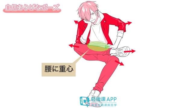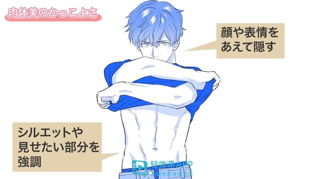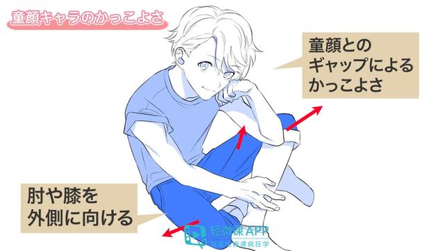 首先,眼神对着镜头,这样的表情能够引人注目。然后,身体上为了让人看到手部肌肉的紧绷感和低体脂的体形,画出了让手肘和膝盖向外侧延伸的姿势。这样,童颜和成熟的姿势结合所形成的“反差帅”就能体现出来了。