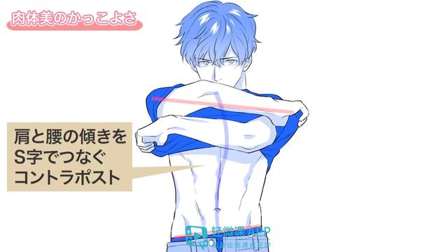 人物将手臂抬起,宽阔的肩部和紧绷的手部肌肉就被强调出来了。从肩膀到腰部呈现出长方形的轮廓,肩部和腰部的线条倾斜,将两条线的中点用反向的“S”线连接起来作为参考线。