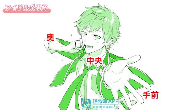 这是一个把手抬高伸向镜头的男性偶像仰视的姿势。这样的姿势,要想在平面上表现出纵深感的话,绘画时重点就在于手部、中间和里面这三个部分。