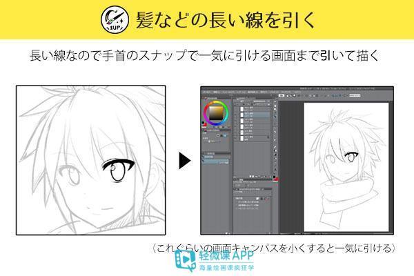 通过有力地画线,可以获得漂亮的外观,调整笔的压力还可以使笔尖变细,通过有意识地绘制“头发流”,可以用线条图表示的纹理会增加。