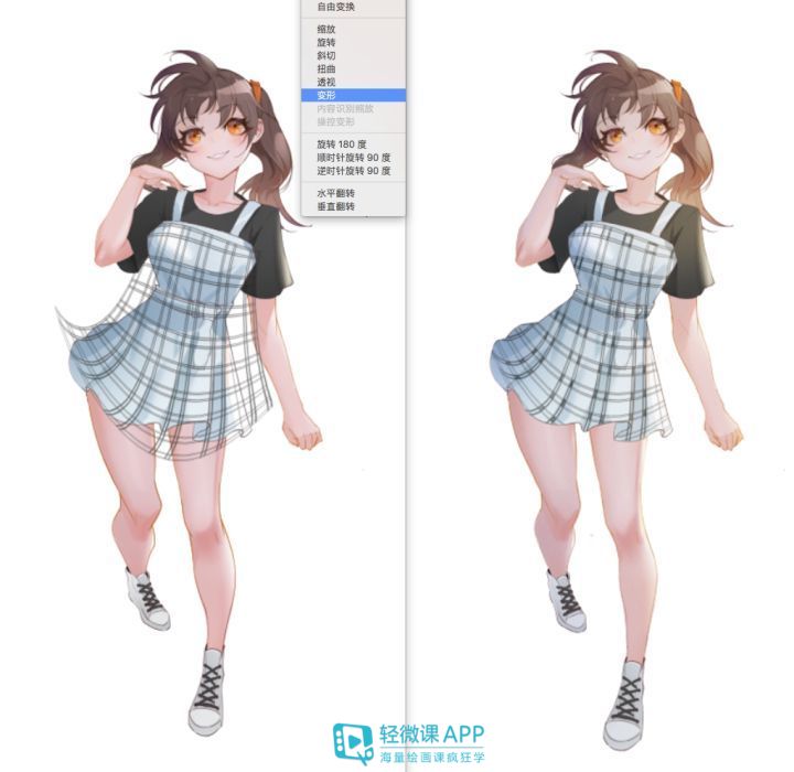 那么再改一下颜色,用叠加图层叠在裙子上,格子裙就搞定啦简单地跟着基本的体积起伏,拉一下变形(选中条纹的图层,ctrl+t之后右键,选择变形):