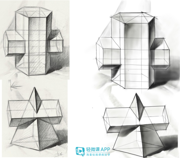 3. 在把握结构时,不能只是单角度看着画,要想象成多角度“摸”着物体画,并注重理解线跟面因为角度而产生的转换关系。