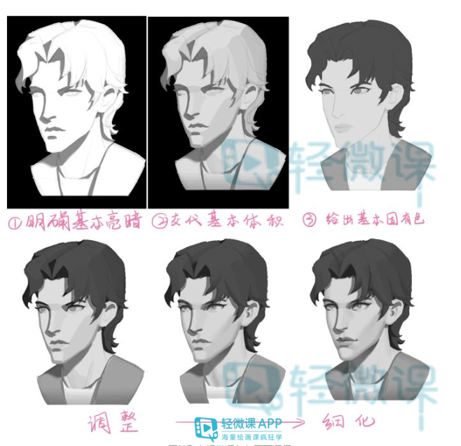 2. 在处理黑白灰的时候,我们先统一基本的亮暗面,再逐步深入、丰富黑白灰层级。