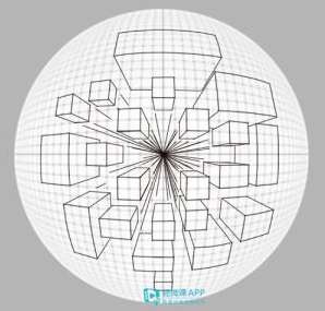 而在这三个基础透视的训练上,强烈建议准备一个魔方随时拿在手上!这样能更好的去观察理解一个方块在不同视角下的变化规律。因为我们是在家里自学很多学习资料跟我们隔了远远不只是一个屏幕的距离。而画画本身就是一个观察事物,总结事物规律的艺术。所以我们有了这些规律上的学习,还需要对事物切身的实际观察。 4. 鱼眼透视 (拓展部分) 这些还只是透视内容中基本的几种透视类型,在实际的绘画中我们后面还会遇到“在视角保持不变,多个物体左右旋转呈不同角度时,如何确定各个物体正确的透视关系。”这种想到都头皮发麻的问题,所以往下这里我们也不再细致的展开讨论了,这种较为复杂的在我们的官网课程中会教的更好。但是在透视这一关的自学上,我想强调的就是要尽量把理论知识跟实际观察结合起来,这样更充分的理解之后,应用的时候只要细心一点想明白,严谨一点的表达清楚就可以啦。