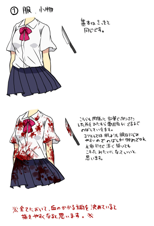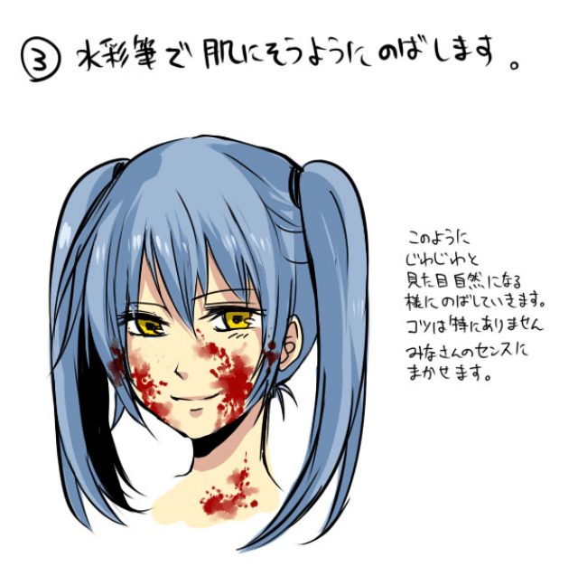如果在增加强度的同时将图像从中心的黑暗部分模糊到外部,您将获得更逼真的印象。 如何在脸上、衣服和配饰上画血①画人物形象
