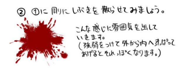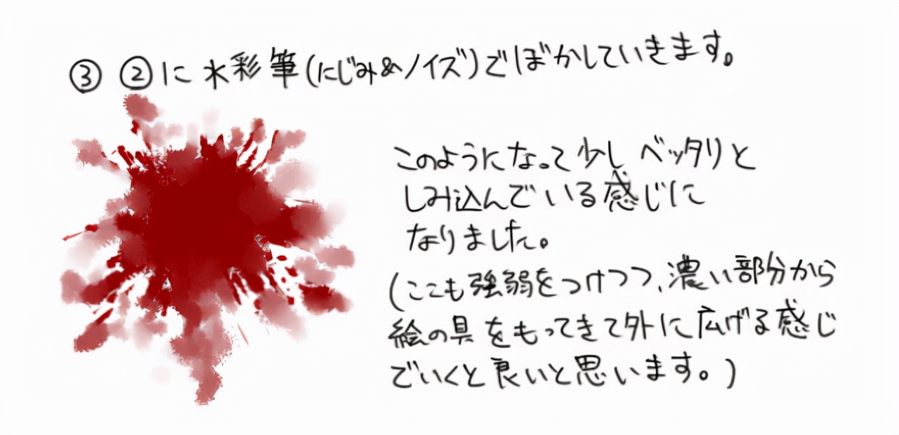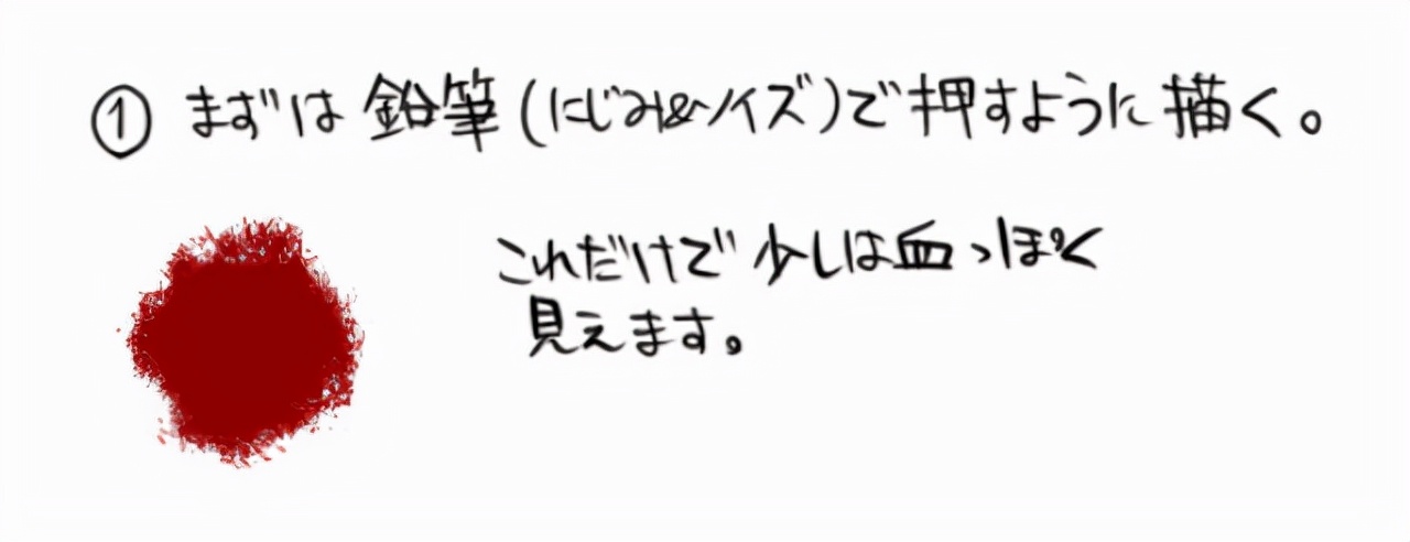 首先,用铅笔按压它来绘制基础部分(出血和噪音)。 (2) 底座周围飞溅