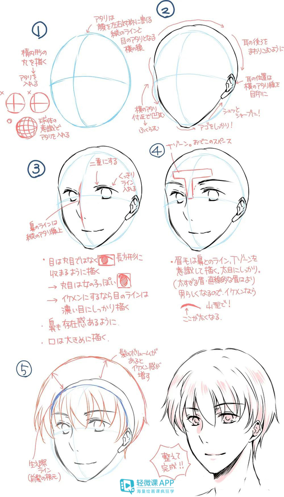 (1)形状上,女生脸型比男生更圆,颌骨更尖;成年男性的脸会更长,颌骨更方,如果脸画圆了,看起来会像小男孩; (2)眼睛上,女生的大眼睛接近正方形,男生的则是长方形,如上图,眼睛大小也是男女生很大的区别点; (3)眉毛不同,男生眉毛更粗更长更硬朗,女生眉毛更细更短更柔软; (4)鼻子表现不同,日系中女生鼻子通常就点一个点,男生则是一条线,显得比较尖锐; (5)嘴巴的话,男女生形状基本一样,只是男生的嘴巴会更大; (6)颈部粗细,男生的脖子会更粗更硬,显得肌肉更紧实; (7)两者的耳朵和头发轮廓体积表现是一样的,只有发型的差别; 以上是日系漫画动画中男女生常见的差异,基本是通用的。了解到以上这些区别之后,我们就可以尝试着动手画一张男性的脸。