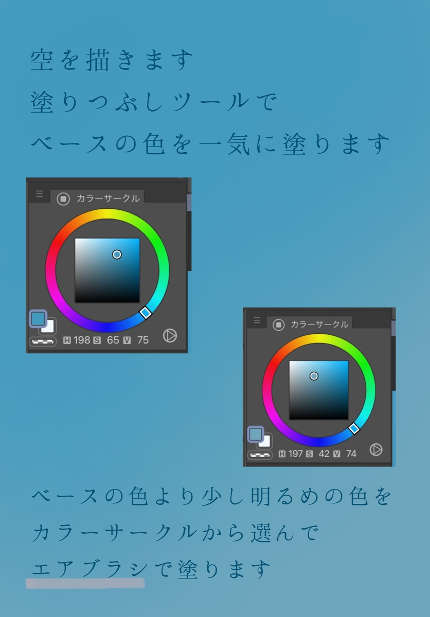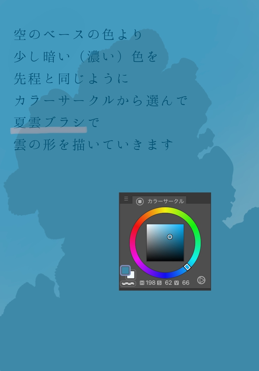 和刚才一样,从颜色圈中选择比天空的底色稍暗(深)的颜色,用夏云刷子描绘云的形状